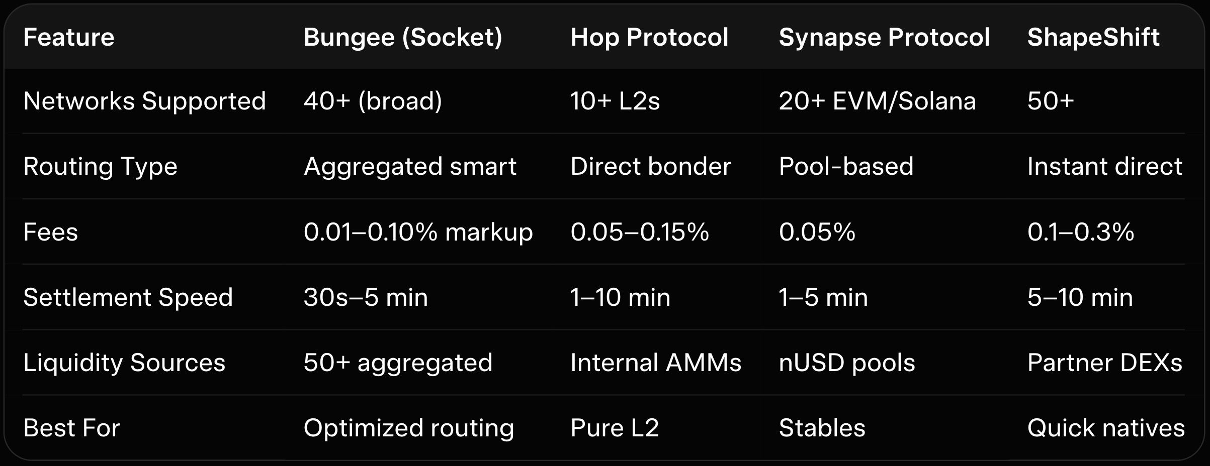 While Bungee excels at aggregating routes within its ecosystem, traders may seek options beyond dependency on its engine or integrated protocols—especially for privacy, exotic chains, or during source congestion.