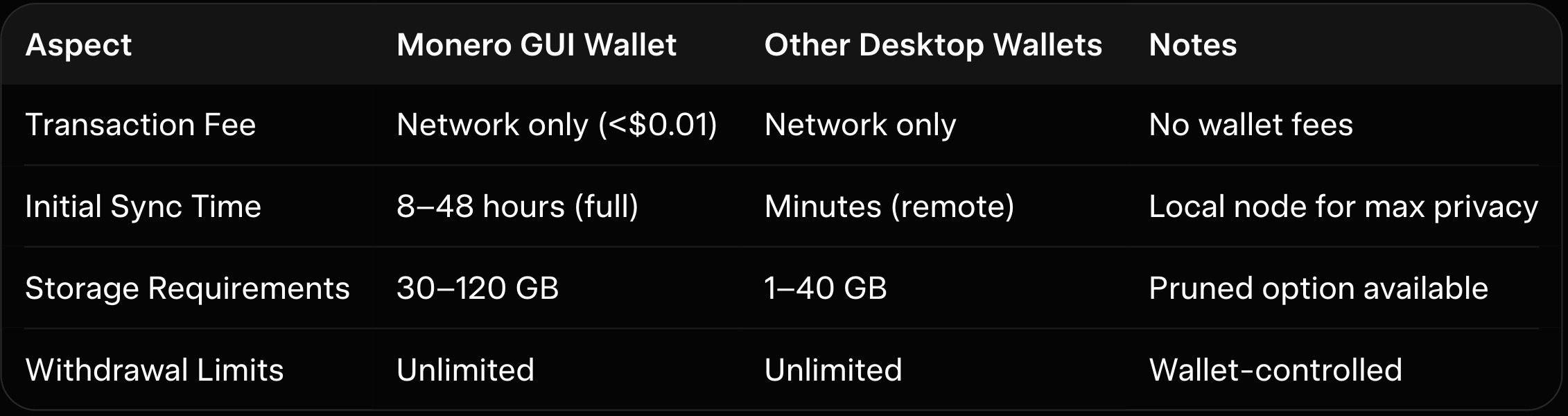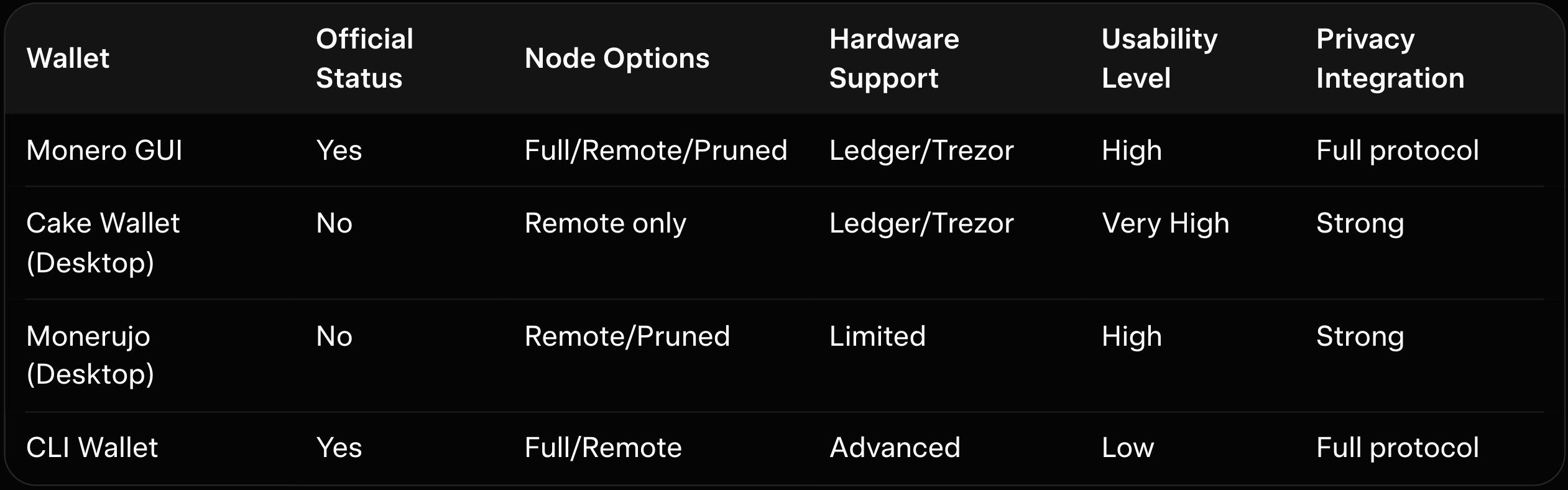The Monero GUI Wallet offers a clean, beginner-friendly interface with tabs for overview, send, receive, and history. Advanced features like subaddresses and integrated mining are available without overwhelming new users. However, initial full-node sync time and higher resource usage (CPU/RAM) can feel heavy compared to lighter wallets. Cake Wallet (desktop version) is more lightweight and mobile-friendly but less official. The CLI wallet is powerful for advanced users but lacks the GUI’s ease of use. As explained in our monero-vs-zcash-vs-dash-privacy-coins-2026, the official GUI strikes the best balance for most desktop users.
