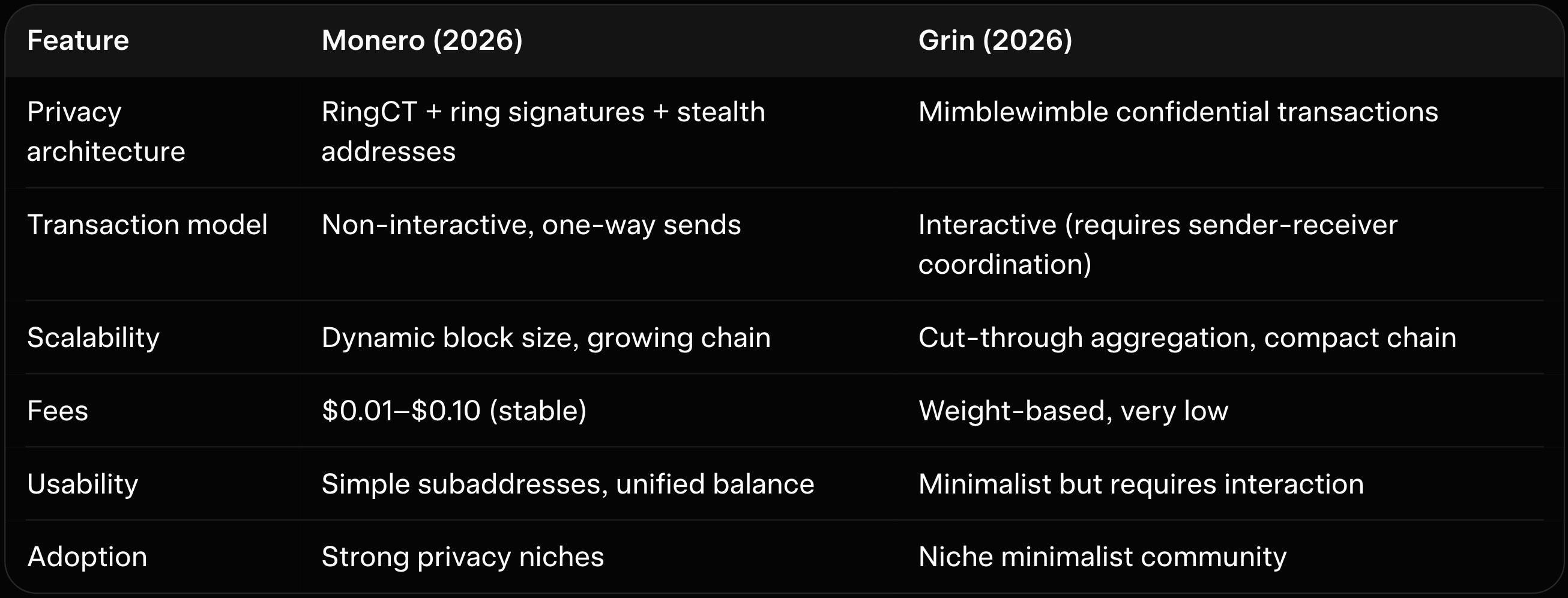 The table reveals the core trade-offs. Monero sacrifices some efficiency for effortless privacy. Grin trades interactivity for a dramatically smaller blockchain footprint.
