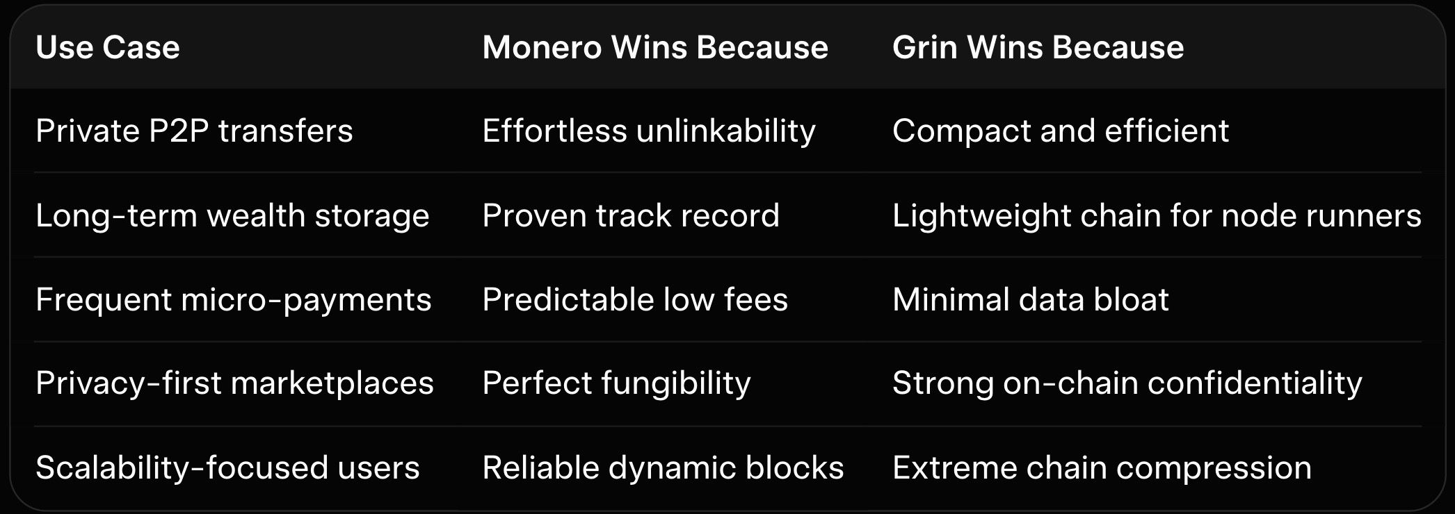 This table shows how the two coins serve overlapping but distinct audiences. Monero prioritizes effortless privacy for everyday users. Grin appeals to those who value technical elegance and future-proof scalability.