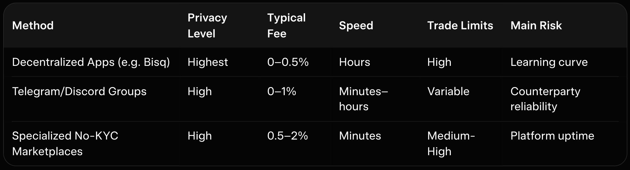 Decentralized apps like Bisq (still active and improved in 2026) allow fully non-custodial trades using multisig escrow and onion routing for anonymity. Users trade fiat for XMR via bank transfer, cash-by-mail, or gift cards, with no central authority holding funds. Telegram and Discord groups with trusted escrow bots handle high volume for cash-in-person or online transfers. Some specialized no-KYC marketplaces focus exclusively on privacy coins. These methods require more user effort but deliver maximum privacy and flexible limits. As explained in our p2p-crypto-trading-2025-best-platforms-buy-bitcoin-without-kyc, P2P platforms prioritize user control over convenience.