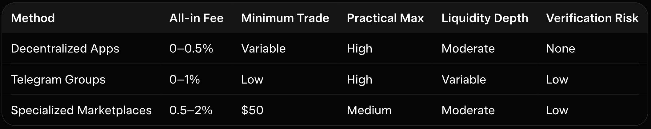 P2P fees are near-zero or 0.5–1%, far lower than CEX spreads and without KYC.