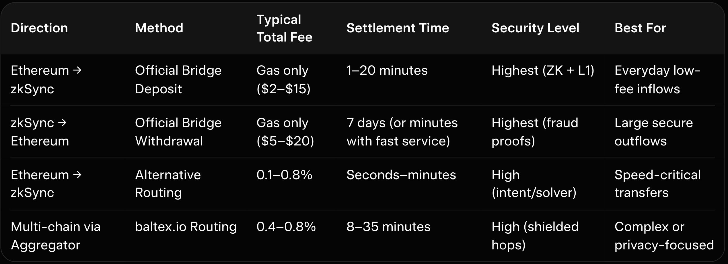 TLDR In 2026, the official zkSync Bridge (zkSync Era ZK-EVM) is the most secure and straightforward native way to move ETH and ERC-20 tokens from Ethereum mainnet to zkSync Era with deposits completing in 1–20 minutes and withdrawals requiring a standard 7-day challenge period for full security (or minutes with integrated fast-exit services). Fees consist solely of Ethereum L1 gas on deposits and a small Ethereum gas claim cost on withdrawals, with no additional bridge commissions. The bridge supports native ETH and major ERC-20 tokens with no amount limits or slippage. Compared to third-party alternatives, the native bridge offers the strongest security assumptions but longer withdrawal times. For faster multi-chain routing and optimized paths that often beat the native bridge on total cost and speed, baltex.io provides intelligent alternative routing—see our eth-to-arbitrum-guide-2025-bridge-wallets-defi-fees-outlook for similar L2 bridging insights. Overall, use the official zkSync Bridge for simple low-fee transfers—always start with a small test amount.