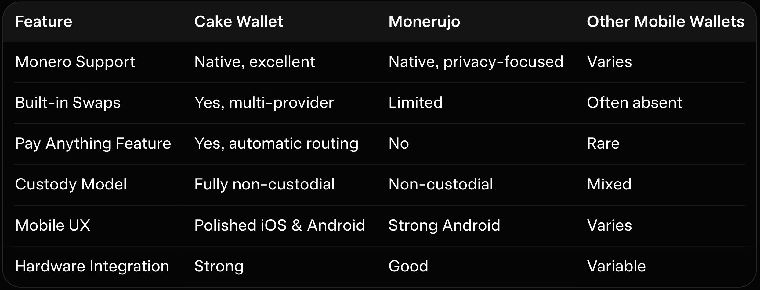 Cake Wallet outperforms many competitors in polish and feature completeness for mobile Monero users. Monerujo offers strong privacy focus on Android but lacks the same level of built-in swaps and cross-chain ease. Other multi-asset wallets often compromise on Monero depth or mobile experience.