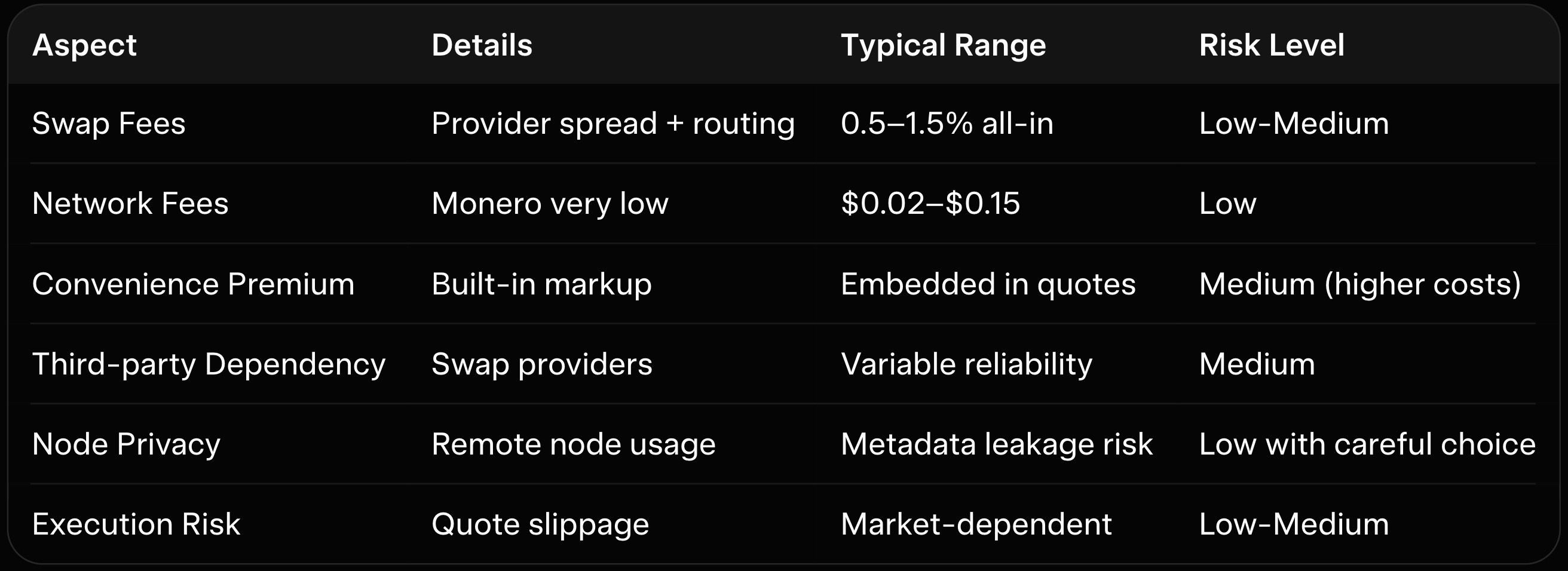 Third-party swap providers introduce variable spreads and occasional execution differences. Quotes remain floating, so market movements during processing can affect final amounts. Users should preview carefully and test small amounts first.