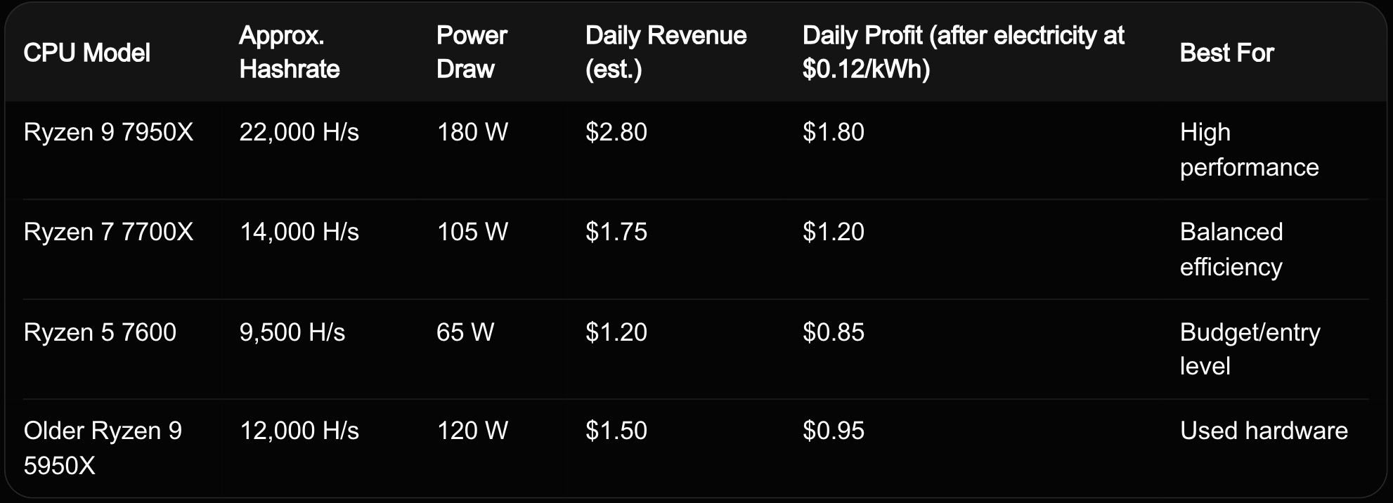 Modern AMD Ryzen CPUs offer the best hashrate-to-power ratio for RandomX.