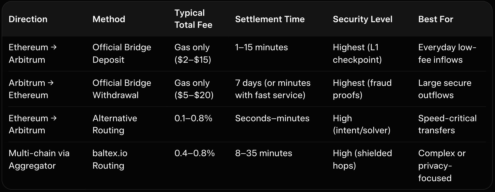 TLDR In 2026, the official Arbitrum Bridge (Arbitrum One) remains the simplest and most secure native method for transferring ETH from Ethereum mainnet to Arbitrum with deposits completing in 1–15 minutes and withdrawals following a standard 7-day challenge period for full security. Fees are driven almost entirely by Ethereum L1 gas costs on deposits, while Arbitrum-side gas stays minimal and withdrawals incur no extra bridge fees. The bridge supports native ETH plus major ERC-20 tokens with no amount limits or slippage. Compared to third-party alternatives, the native bridge offers unmatched security for large ETH moves but longer withdrawal times. For faster multi-chain routing and optimized paths that often beat the native bridge on total cost and speed, baltex.io provides intelligent alternative routing—see our arbitrum-nova-2025-guide-cheaper-faster-vs-base for detailed comparisons. Overall, use the official Arbitrum Bridge for straightforward low-fee ETH transfers—always start with a small test amount.