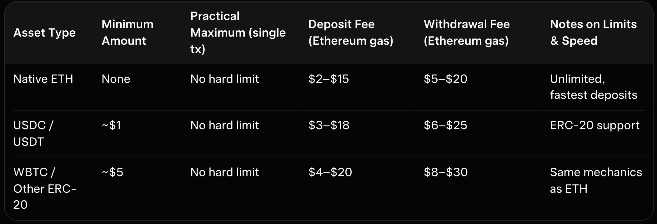 Here is a clear transfer comparison table for ETH moves in 2026: