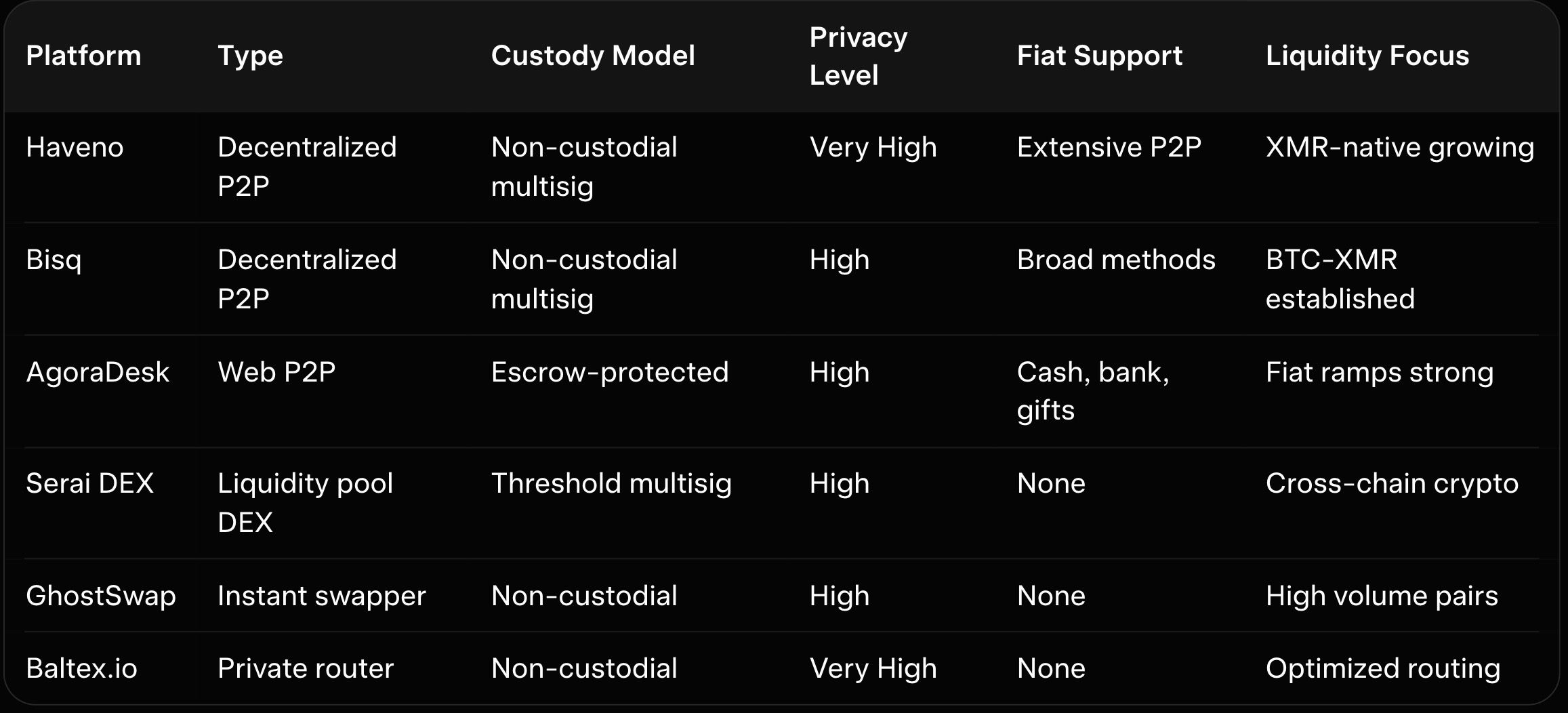 Haveno leads as the closest spiritual successor for fiat-to-XMR P2P trading. The Monero-native decentralized exchange uses Tor and multisig escrow for maximum privacy. It supports diverse payment methods through peer agreements while growing liquidity steadily.