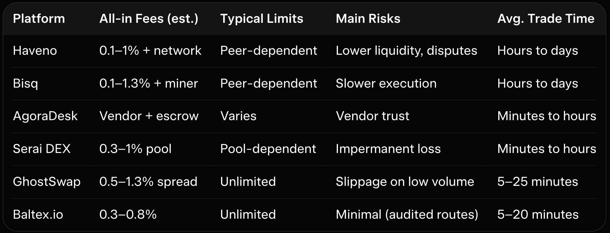 P2P platforms sacrifice speed for sovereignty and fiat depth. Users accept longer timelines and manual negotiation for unlinkable trades. Instant swappers reverse this with convenience but lack direct fiat options.