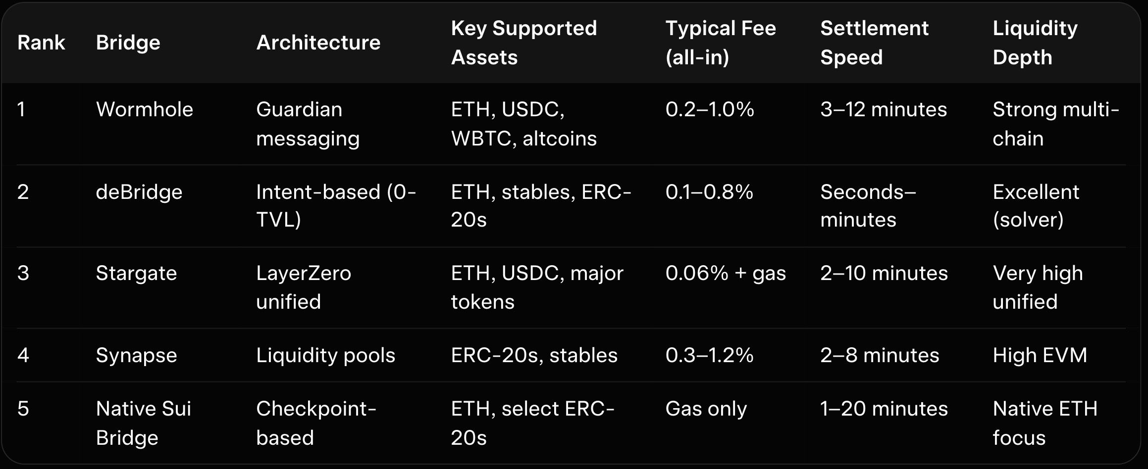 Transfer speed has improved dramatically in 2026. Intent-based bridges like deBridge achieve real-time or sub-minute execution on Ethereum-to-Sui routes by matching orders off-chain. Wormhole and Stargate typically finalize in 2–10 minutes thanks to decentralized messaging and unified pools. The native Sui Bridge settles in 1–20 minutes but can experience checkpoint delays during high Ethereum congestion. Liquidity sources are key: Wormhole and deBridge draw from dynamic solvers and guardians for deep depth, Stargate uses unified pools for consistent pricing, and Synapse optimizes EVM liquidity.