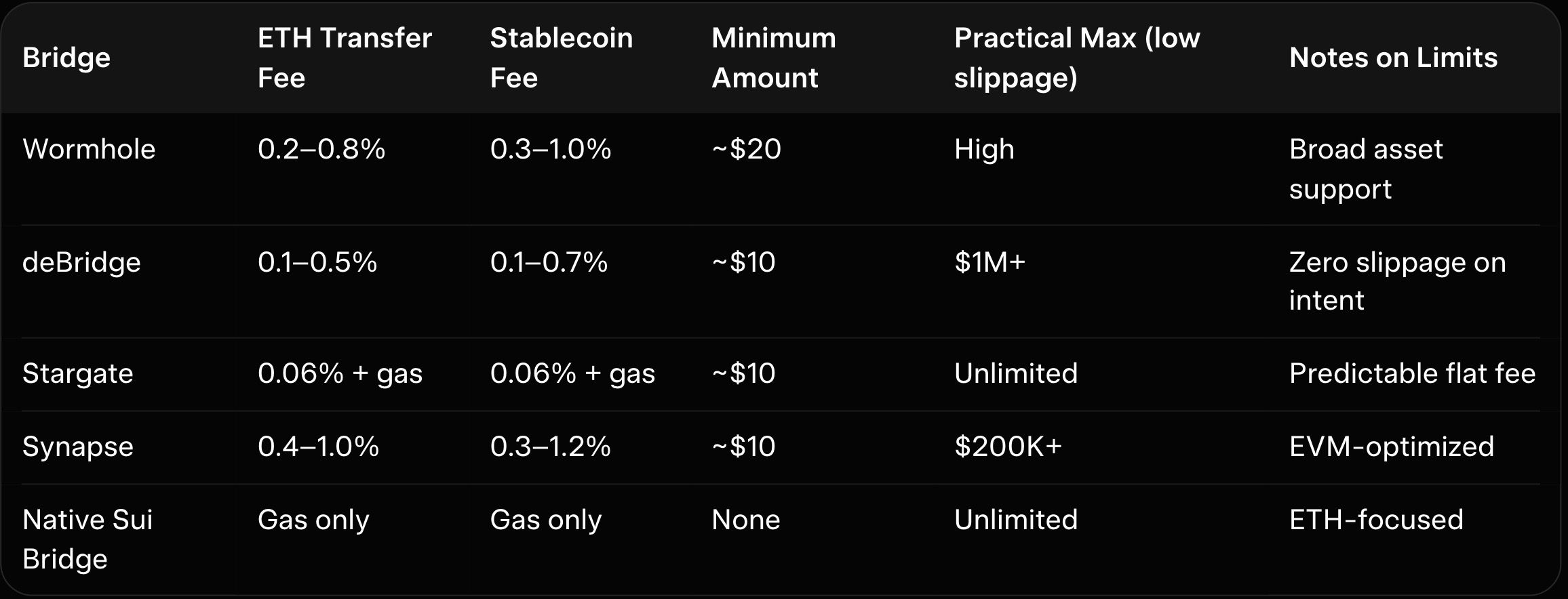 Here is a fees and limits overview for popular Ethereum-to-Sui routes (2026 averages):